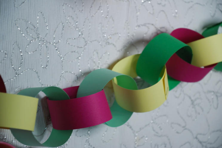 Du behöver färgat papper, sax och tex tejp eller häftapparat att häfta ihop ringarna med.