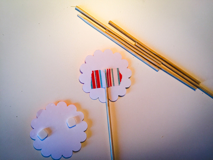 4. Montera ihop blommorna genom att tejpa fast pinnen på baksidan av ena blomman. Sätt häftkuddar på den andra. För sedan ihop, se till att blombladen går jämt ut och inte ligger omlott.