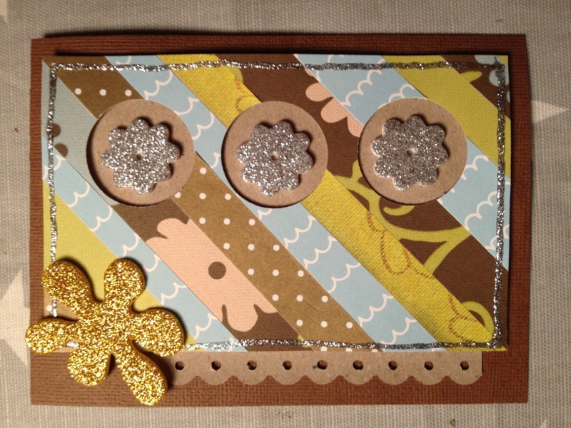 Använd det nya pappret som bakgrund eller dekoration på ett kort. Så här fint blir det med lite glittrrdekorationer och glitterlim från Panduro.