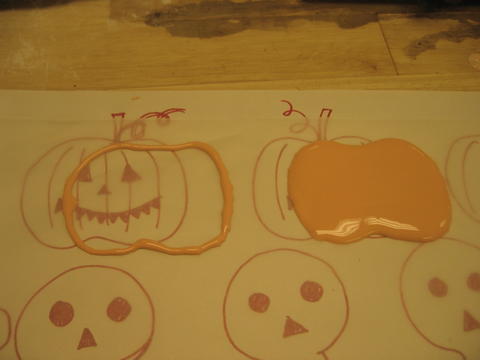 Baka marängerna på ca 140 grader i 35 – 40 minuter, dom ska inte vara helt stela. När dom svalnat kan man dekorera dom med vanlig smält choklad, pumporna valde jag att dekorera på framsidan men spökerna och döskallarna fick sin choklad på baksidan då framsidan vart väldigt bubblig.