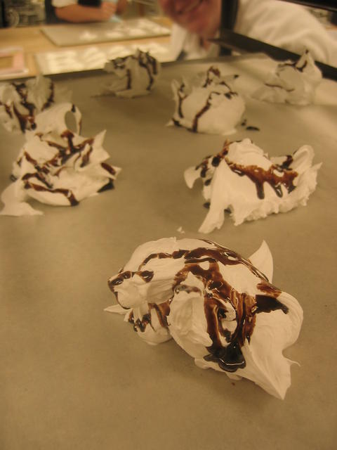 Sådana här chokladmaränger gör du lätt med en sked, bara ta en klick och klutta upp på en plåt, ringla lite chokladsås över, ev dra med änden på en sked eller liknande på marängen för att blanda in chokladen.