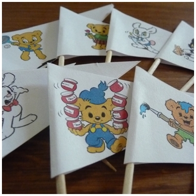 Förra året, sonens första kalas, var det minidisco som gällde, i år är det nåt helt annat. Önskemålet för årets kalas var tidigt klart, ett Bamsekalas stod högst på listan. Temat i sig är det inget fel på men det kräver en hel del egen insats, för temat tycks inte vara så vanligt, åtminstone inte i våra trakter. Hur som helst, med temat i åtanke är det bara fantasin som sätter gränser. Tanken är att kunna hålla den röda tråden genom både inbjudan, tårta, tilltugg och lekar. Först ut är små vimplar, lämpliga att sticka ner i något bakverk, och väldigt enkla att göra.