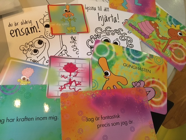 De har även testat inspirationskort, eller så kallade afffirmationskort. Tanken med dem är att lägga ut dem på yogamattan berätta vad det står och prata om vad det betyder för barnet som läser det. Positiva ord och meningar som skapar känslor i kroppen och som gör att vi mår bra. Idén är att man t ex drar ett kort varje dag och läser meningen på kortet och låter det hänga med under dagen.