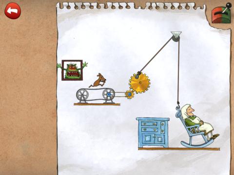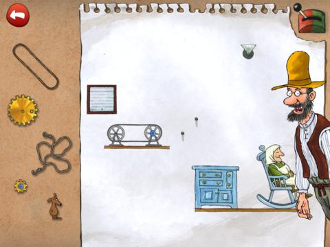 Appen innehåller 25 olika uppfinningar, med stegrande svårighetsgrad. Efter varje löst problem får man ett kugghjul som belöning. Kugghjulen behöver man sen i lösningen av det sista problemet. Så här ser startsidan ut (här har vi löst en del problem och fått några kugghjul som belöning).